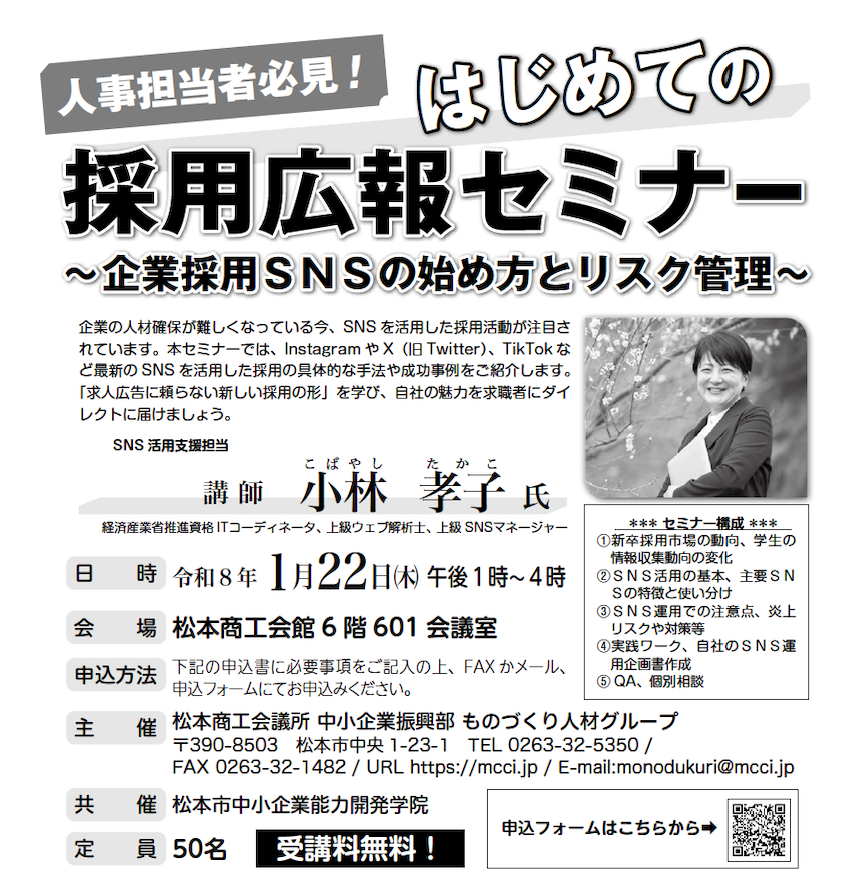 来たる2026年1月22日(木)、松本商工会議所にて「はじめての採用広報セミナー」の講師を務めさせていただきます。